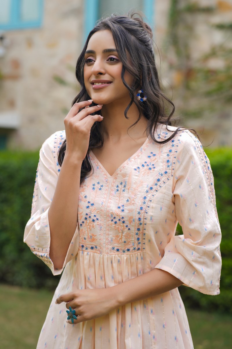 Peach Cotton Dress with Subtle Blue Thread Embroidery